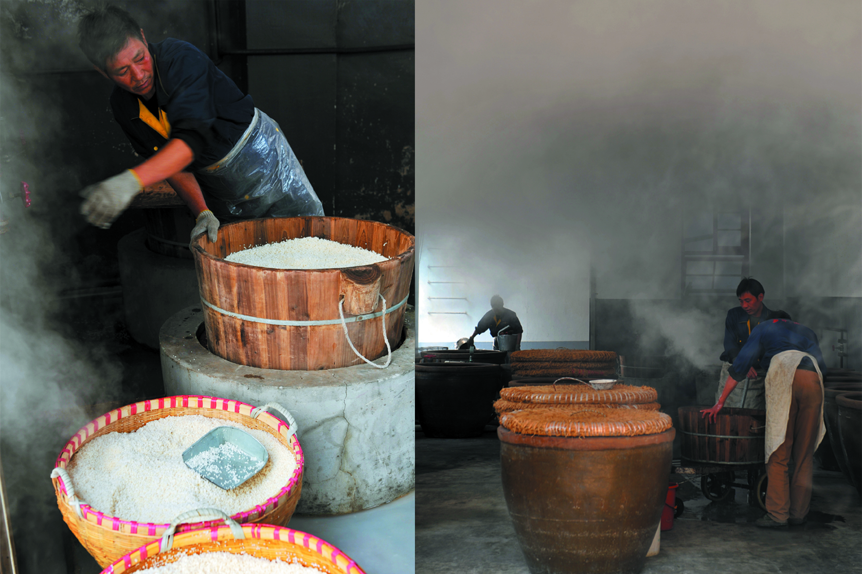 冬釀最關(guān)鍵、最神秘的環(huán)節(jié)非“開耙”莫屬。上好的糯米浸泡之后蒸熟、拌進麥曲,被倒入大缸里開始發(fā)酵。發(fā)酵過程中缸內(nèi)原料的溫度會發(fā)生微妙變化,當溫度上升過快時,需要釀酒師傅及時干預攪拌冷卻,俗稱“開耙”。其作用是調(diào)節(jié)發(fā)酵醪的溫度,補充新鮮空氣,以利于微生物生長繁殖。開耙技術(shù)的好壞關(guān)系到成品酒的品質(zhì)高低,它是整個釀酒工藝中最難控制的關(guān)鍵性技術(shù),通常由經(jīng)驗豐富的老師傅把關(guān)。