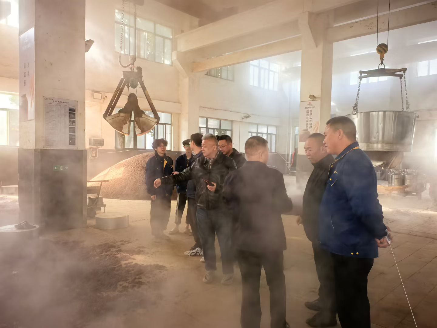 清晨的玉祁酒業(yè)釀造車(chē)間,蒸汽氤氳間彌漫著醇厚的糧香與曲香。王昭亮主任與徐巖教授團(tuán)隊(duì)直奔生產(chǎn)現(xiàn)場(chǎng),沿著 “12987” 大曲坤沙工藝的關(guān)鍵環(huán)節(jié),從酒醅攤涼、堆積發(fā)酵到入窖密封,逐一細(xì)致考察。作為堅(jiān)守 “端午制曲、重陽(yáng)下沙” 傳統(tǒng)的江南醬酒,其一年生產(chǎn)周期、兩次投料、九次蒸煮、八次發(fā)酵、七次取酒的復(fù)雜工藝,與王昭亮主任深耕的茅臺(tái)核心工藝一脈相承。